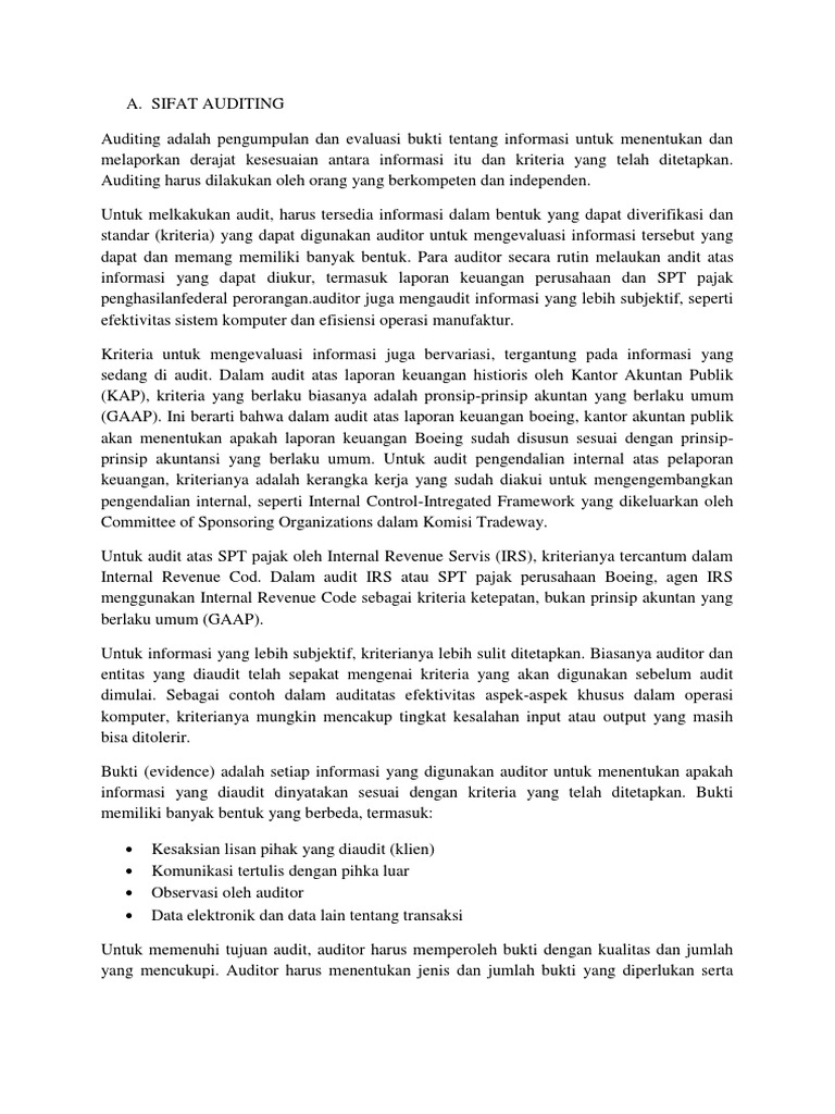 Maksud dari pembagian ini adalah untuk menentukan tujuan atau sasaran yang ingin dicapai dengan adanya pengauditan merupakan suatu pemeriksaan yang hanya terbatas hanya pada permintaan audit yang dilakukan oleh kantor akuntan publik (kap). Pembagian jenis penelitian secara lebih kompleks antara lain penelitian deskriptif, korelasional, evaluasi, simulasi, survei, studi kasus, entografi, cultural dan masih banyak lagi yang. Pada jenis detailed audit, proses pengauditan dilakukan secara menyeluruh terhadap semua aspek yang harus diperiksa. Untuk pengertian dari audit sendiri. Bukti audit auditor akan memperoleh bukti audit yang relevan dan reliable untuk memberikan kesimpulan rasional. Program diploma iv politeknik keuangan negara stan 8b akuntansi alih program kelompok 1 1. Audit dilakukan oleh yang kompeten, objektif, dan tidak memihak, yang disebut auditor. Contoh lain dalam hal kreditur preferen adalah pajak yang dikenakan oleh negara, dan kemudian berdasarkan putusan mahkamah konstitusi no. Terdapat 4 (empat) jenis opini yang dapat dikemukakan, yaitu aplikasi standar akuntansi secara tidak konsisten apabila terdapat perubahan yang tidak disebabkan oleh transaksi maupun kejadian tertentu, maka auditor perlu menjelaskan perubahan ini dalam paragraf penjelasan. Written by deta friday, march 13, 2009 2 comments edit. Oleh itu, merumuskan hasil jenis ancaman audit semasa menjalankan audit, adalah mungkin membuat kesimpulan logik. Jenis audit bisa dibedakan menjadi dua yakni general audit yang umumnya dilakukan oleh auditor independen dengan tujuan untuk memberikan pendapat mengenai kewajaran laporan keuangan secara menyeluruh. Secara umum, definisi audit adalah pemeriksaan formal atas akun laporan keuangan yang dihasilkan oleh suatu individu, bisnis, atau organisasi.