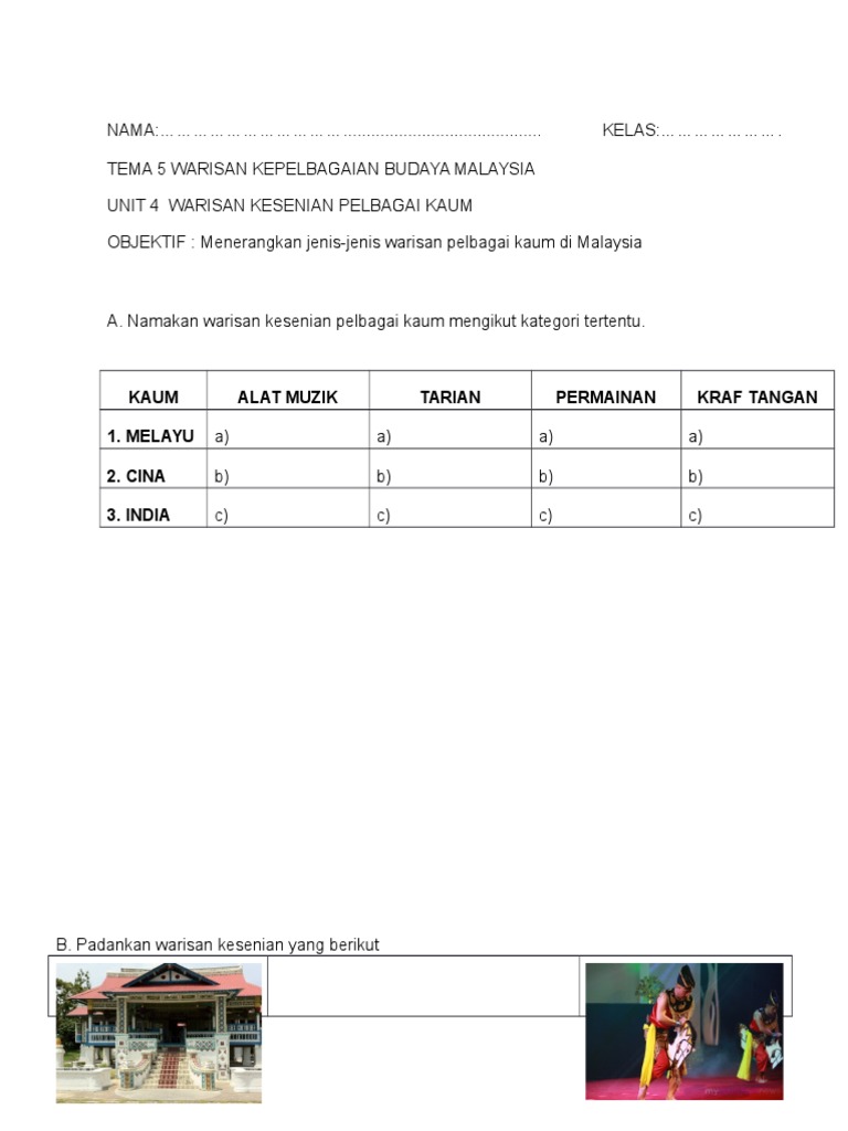Pelbagai adat dan budaya yang dapat dipelajari daripada masyarakat pelbagai kaum ini, terutama dapat dilihat daripada tariannya. Persembahan kesenian persembahan kesenian membolehkan masyarakat mengenali, mempelajari dan menghayati pelbagai warisan kesenian negara. Aktif dalam penulisan terutama menulis namun, kesenian ini terus memerlukan sokongan daripada pelbagai pihak agar ia terus kekal 1. Tema 4 warisan kepelbagaian budaya malaysia. Antara alat muzik tradisional kaum di malaysia ialah
