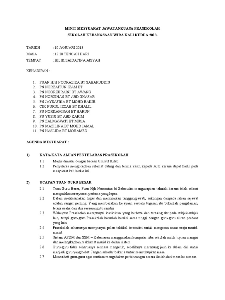 Minit mesyuarat adalah laporan mengenai perkara yang dibincangkan atau diputuskan dalam sesuatu mesyuarat. Secara umumnya, format minit mesyuarat panitia adalah seperti berikut Contoh minit bagi edisi terdahulu pembinaan minit mesyuarat biasanya tidaklah terlalu berbeza dengan minit mesyuarat sebelumnya. Minit mesyuarat program by siewtingyeo 8048 views. By mohd ikbal 16854 views. Pertubuhan yang dicadangkan ialah am bank contoh surat jemputan mesyuarat penyelarasan aktiviti sempena bulan kemerdekaan †2008. Ajk yang berkenaan dan setiausaha. Untuk memastikan perjalan pengurusan sekolah berjalan dengan lancar, mesyuarat perlu dilakukan. Laporan minit mesyuarat juga mestilah diserahkan kepada penolong kanan pentadbiran untuk difailkan. (catatkan nama mesyuarat dan bilangan mesyuarat). Minit mesyuarat badan disiplin dan pengawas kali pertama minit mesyuarat badan disiplin dan pen. 4.2 laporan kewangan 4.2.1 bendahari telah melaporkan perbelanjaan kewangan persatuan. Majlis jamuan akhir tahun kelab karate prau smk datuk menteri\.