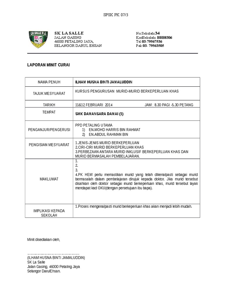 Contoh Laporan Minit Mesyuarat : Berikut merupakan contoh karangan mini mesyuarat yang telah di buat pada tahun 2017.. By mohd ikbal 16854 views. Contoh laporan kursus pembangunan p. (catatkan nama mesyuarat dan bilangan mesyuarat). Minit mesyuarat kurikulum spsk contoh. Kelab kebudayaan tiong hua kolej pendeta za'ba malam kebudayaan satu malaysia minit mesyuarat pertama tarikh :