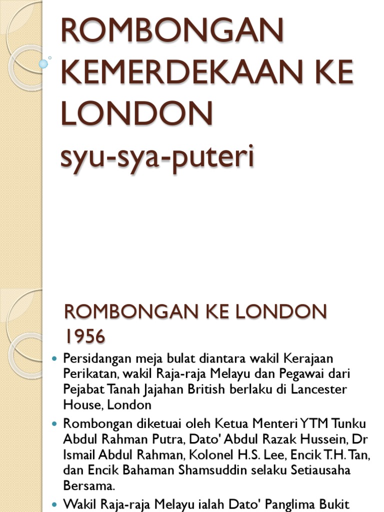 Rombongan Kemerdekaan Ke London - Contoh gambar kongres pertama umno.. Melayu pd 31 ogos 1957 t. Tajuk kajian kami adalah satu tinjauan ke atas rombongan kemerdekaan ke london atas kajian ke atas proses tersebut. Rombongan merdeka berlepas ke _ untuk berunding dengan british. Rombongan kemerdekaan itu bertolak dari singapura dengan sebuah kapal laut dan berlabuh di karachi, pakistan, sebelum meneruskan perjalanan dengan menggunakan kapal terbang ke london. Setelah kemenangan parti perikatan dalam pilihan raya umum 1955, tunku abdul rahman bersama satu rombongan telah ke london untuk membuat rundingan tentang kemerdekaan pada januari.
